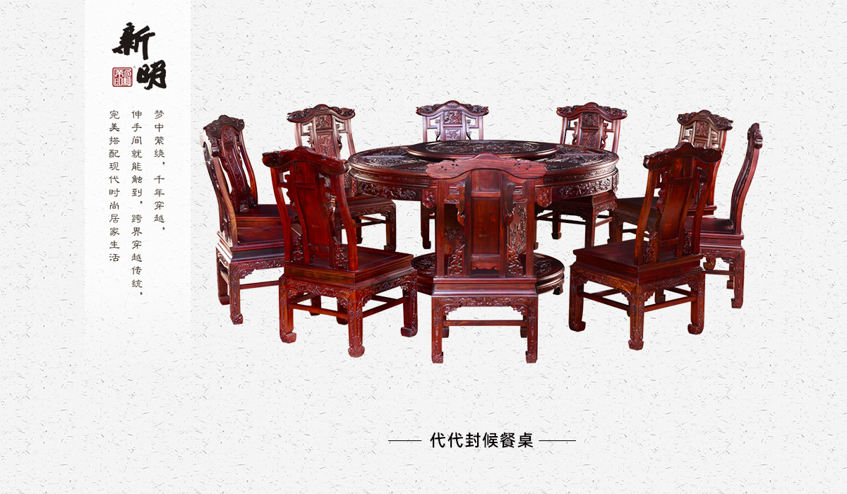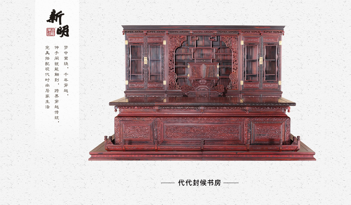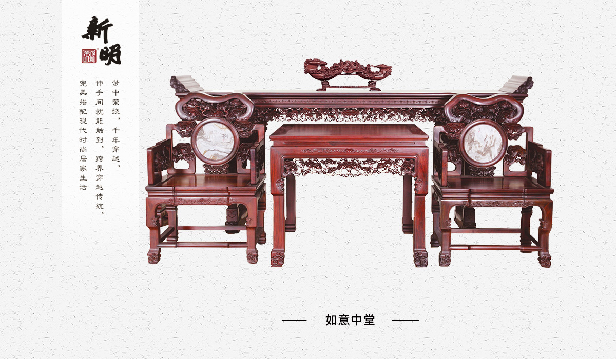 東陽市新明紅木家具有限公司由創始人中國傳統工藝大師張新民先生在1995年2月創建于擁有“百工之鄉”、“木雕之鄉”的浙江省東陽市橫店鎮,是一家集研發、設計、生產、銷售于一體的國內大型專業生產紅木家具的綜合型企業。經過30年的持續發展,到今天已經成為目前國內紅木行業規模很大的企業之一。公司占地面積70畝,擁有生產車間面積12萬多平方米,展館面積1.5萬多平方米,行政、辦公、會議、倉儲面積2.8萬多平方米。公司目前設有6個藝術展館;①號為大紅酸枝博覽館,②十里紅妝古典藝術館,③墨語新美學家居館,④號為中式全屋整裝館,⑤號為新中式家居館,⑥號新品發布館。3000余平方的國際會議中心,將可同時容納全國二百家多家專賣店學習、培訓、會議。員工總人數達500余名,產值3.8億。